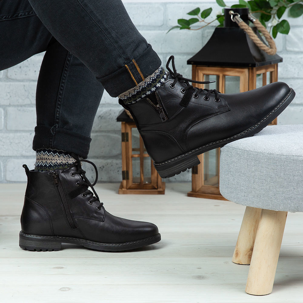 Ghete bărbați din piele naturală de culoare neagră, cu interior confortabil din blană și talpă din TR.