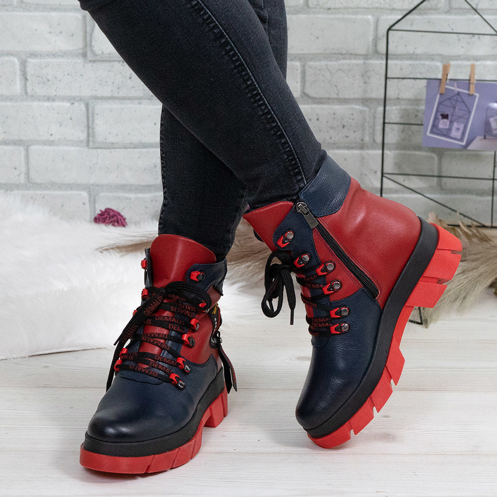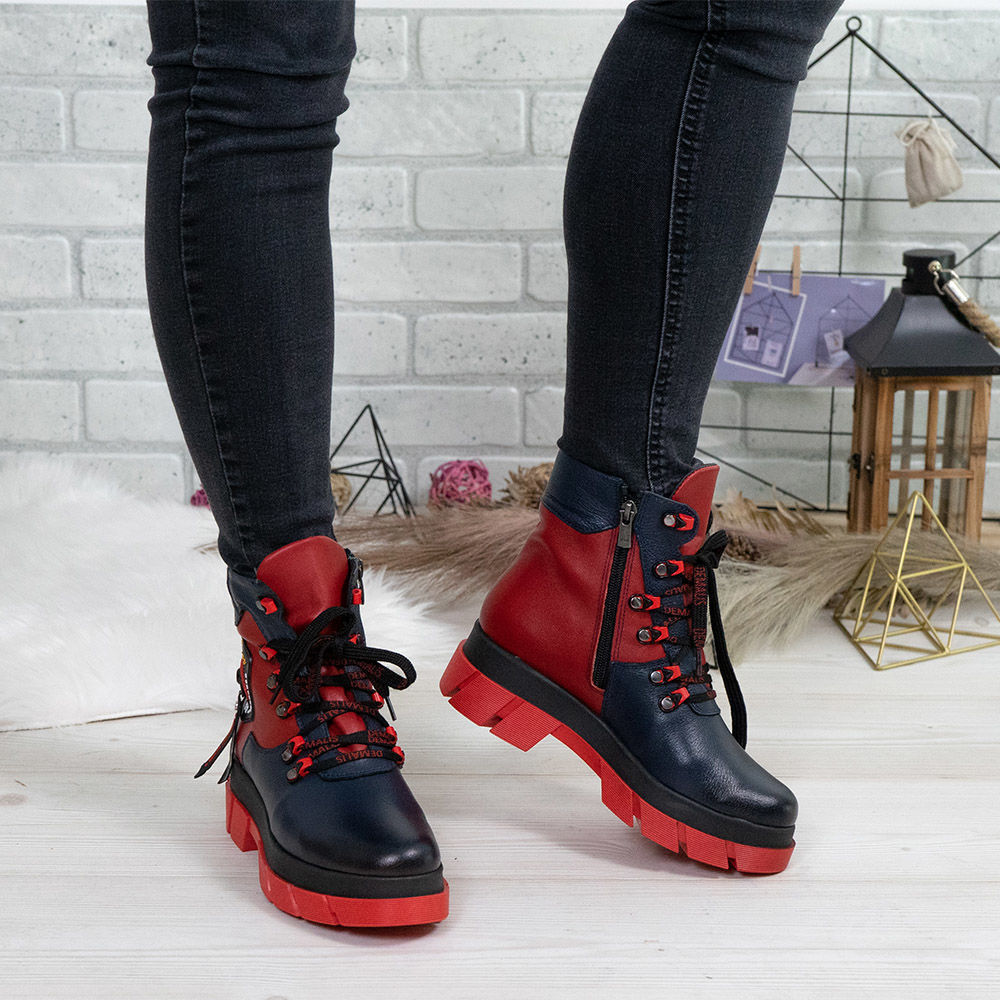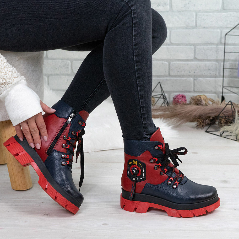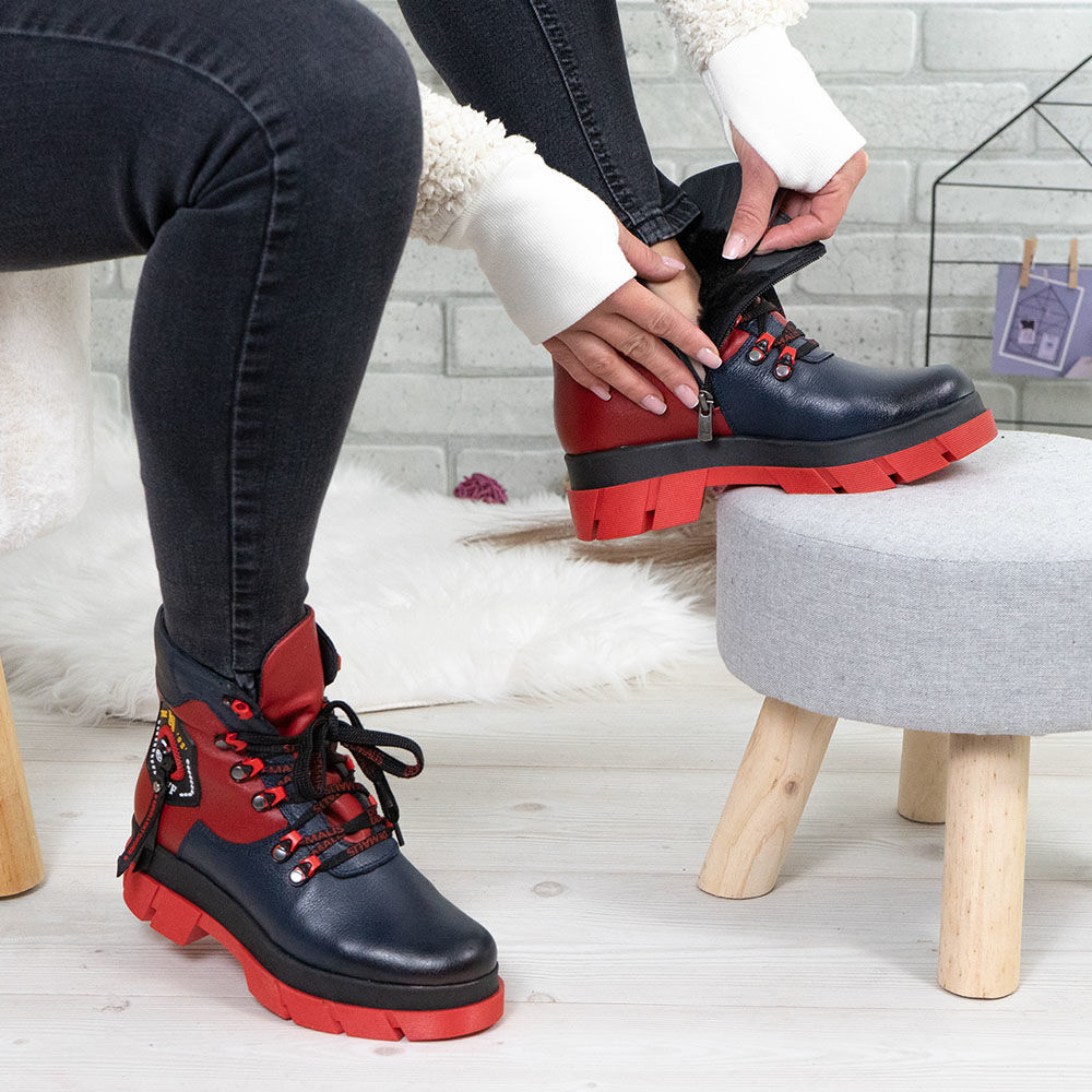 Ghete damă din piele naturală de culoare bleumarin cu roșu, cu interior confortabil din blană și talpă antiderapantă din TR.