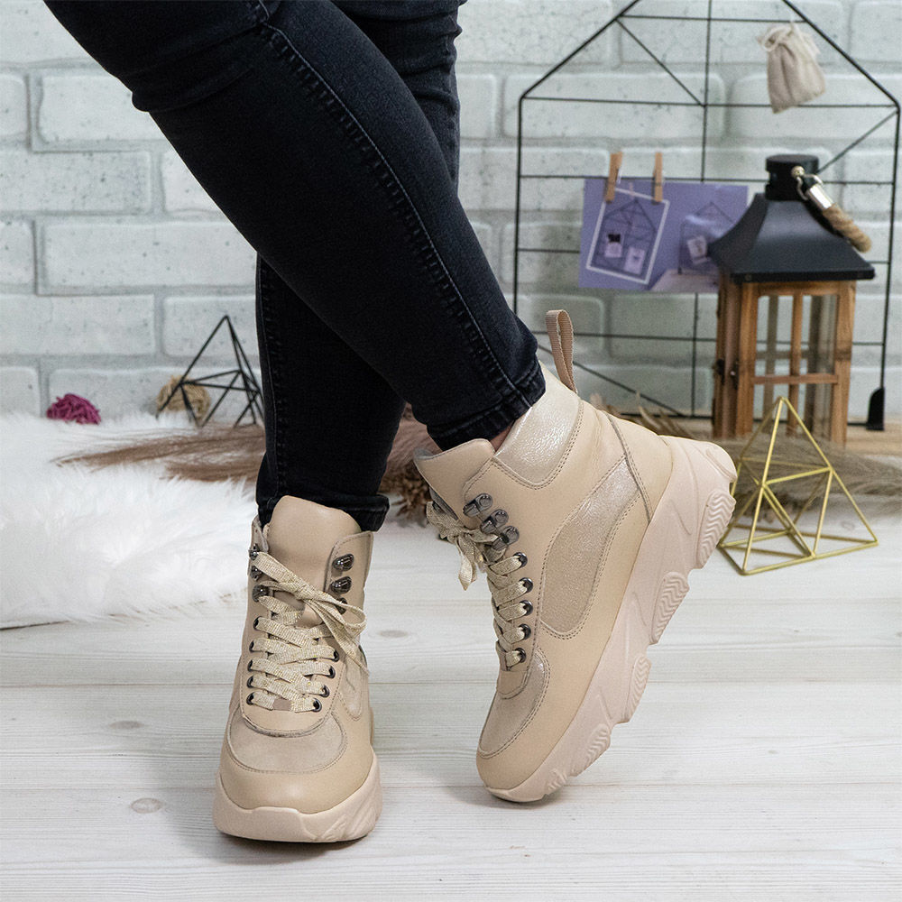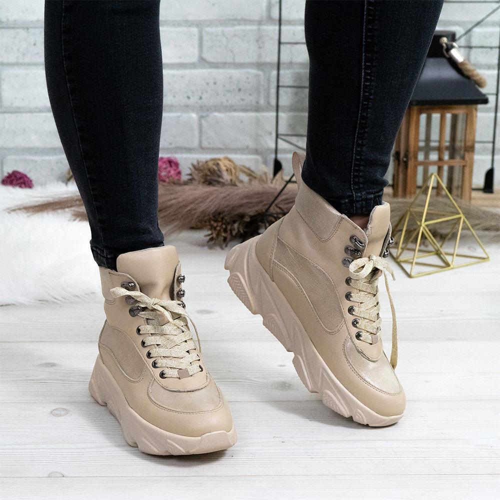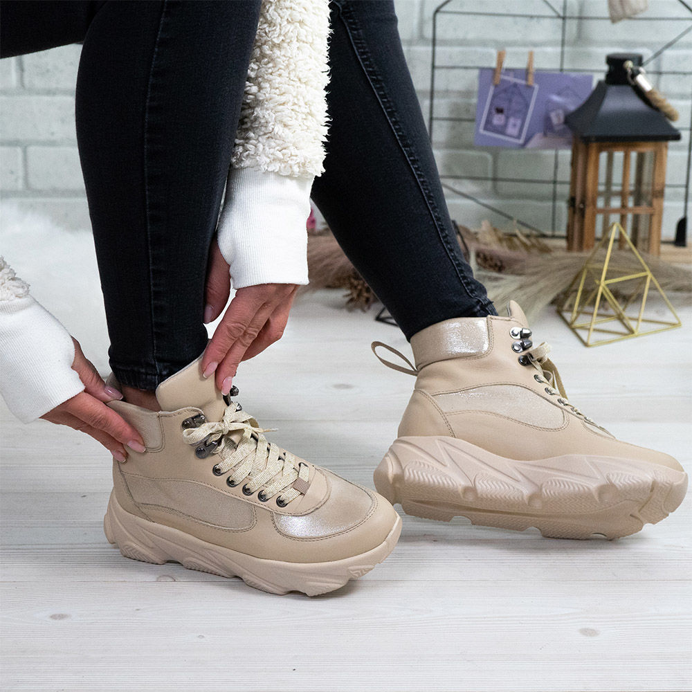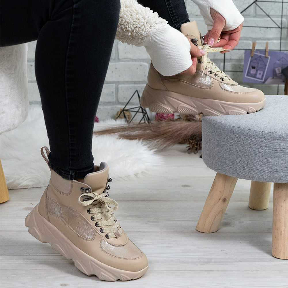 Ghete damă din piele naturală de culoare bej, cu interior confortabil din blană și talpă antiderapantă din cauciuc natural.