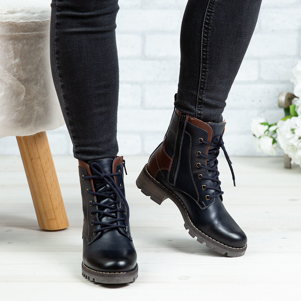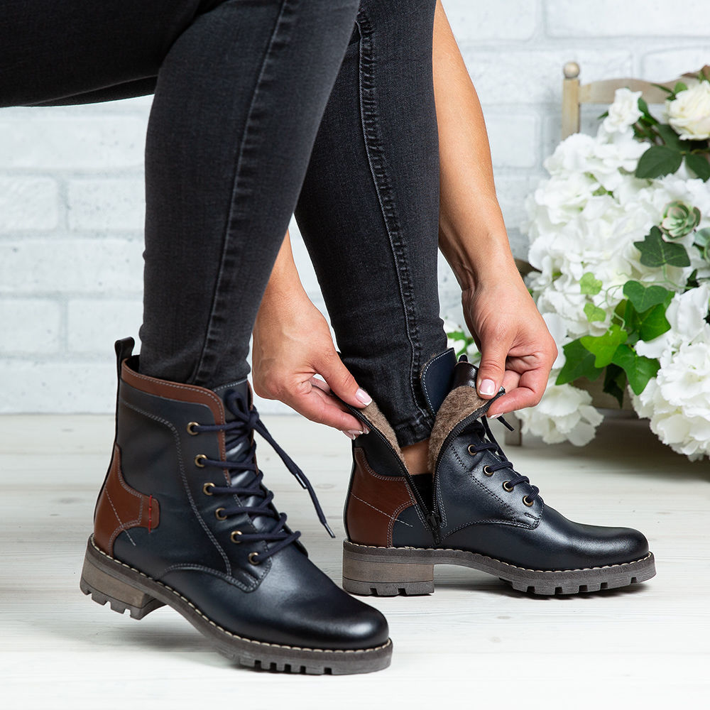 Ghete damă din piele naturală de culoare bleumarin, cu interior confortabil din blană  și talpă extra light ușoară.