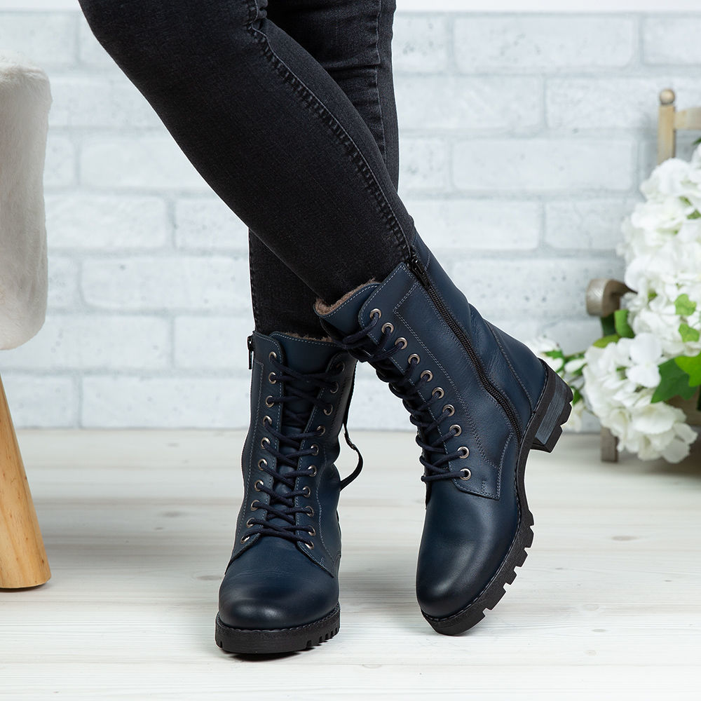 Ghete damă din piele naturală de culoare bleumarin, cu interior confortabil din blană și talpă extra light.