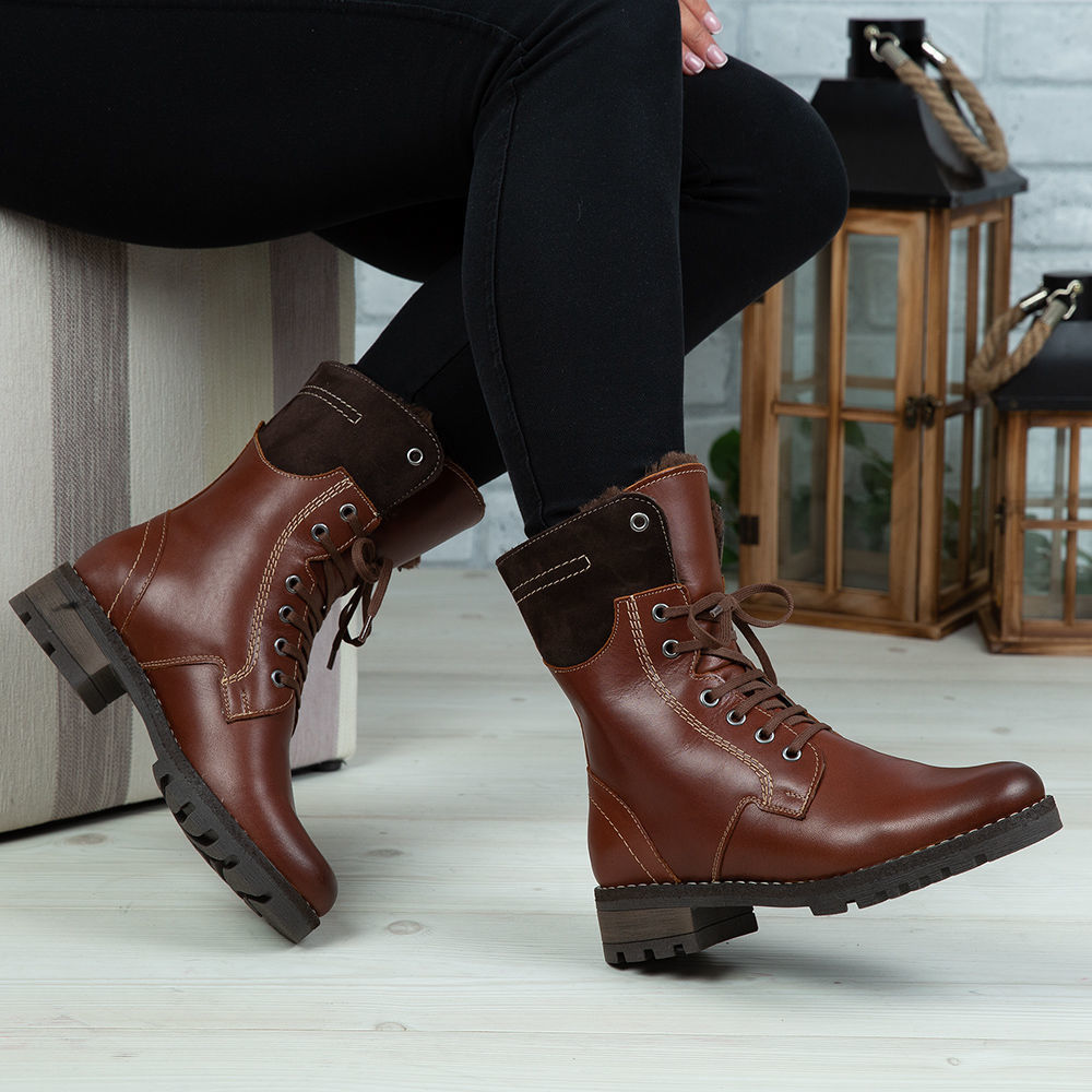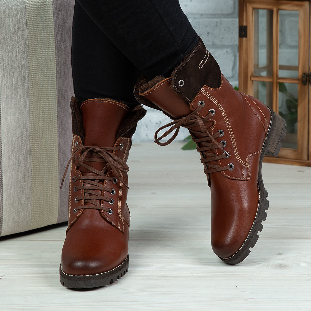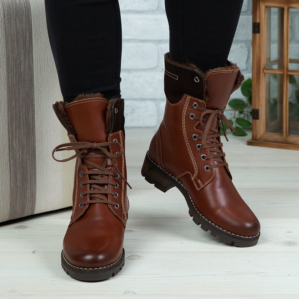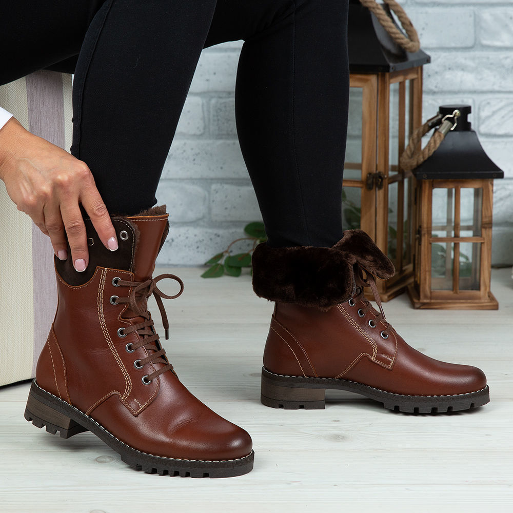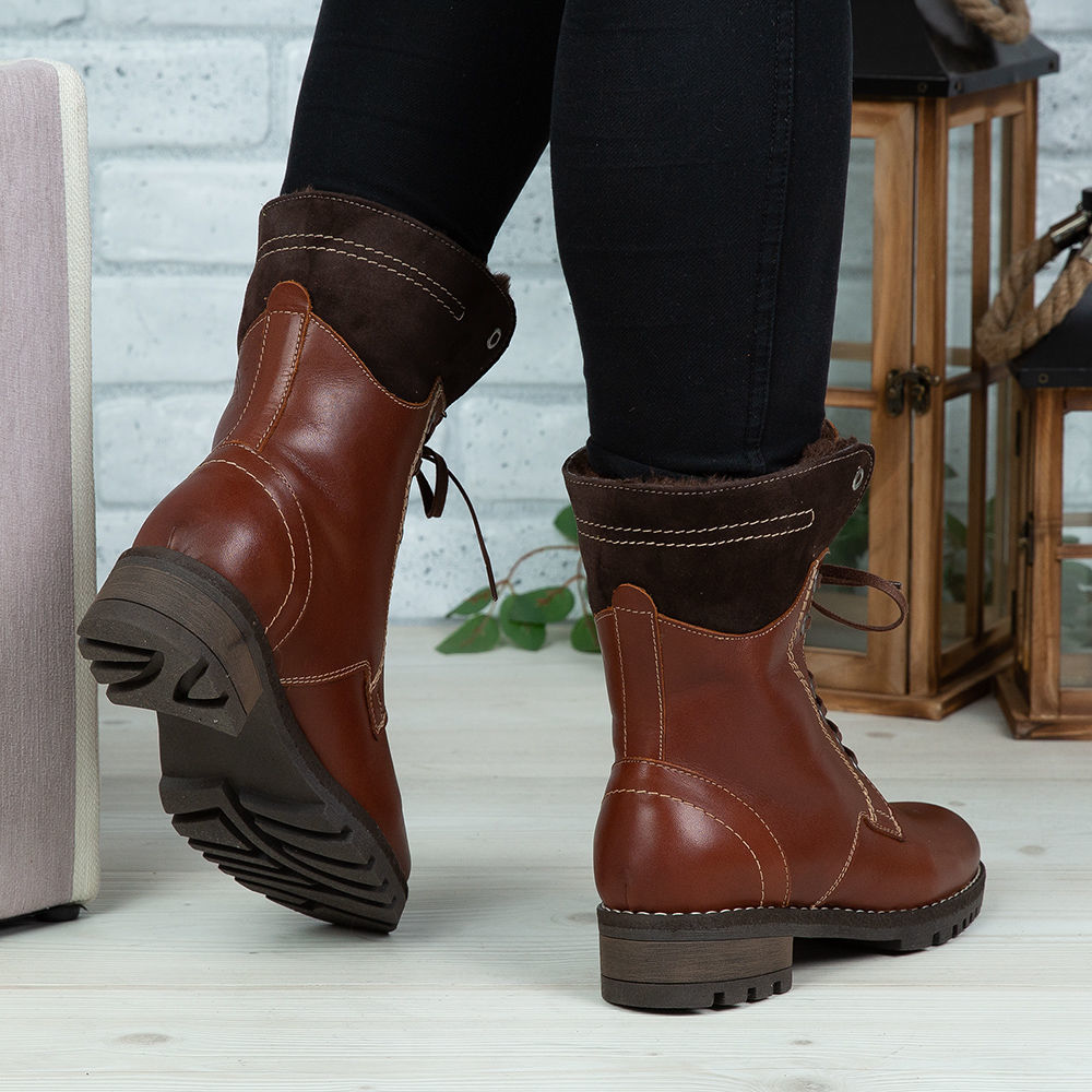 Ghete damă din piele naturală de culoare maro, cu interior confortabil din blană  și talpă antiderapanta.