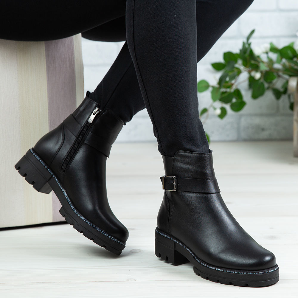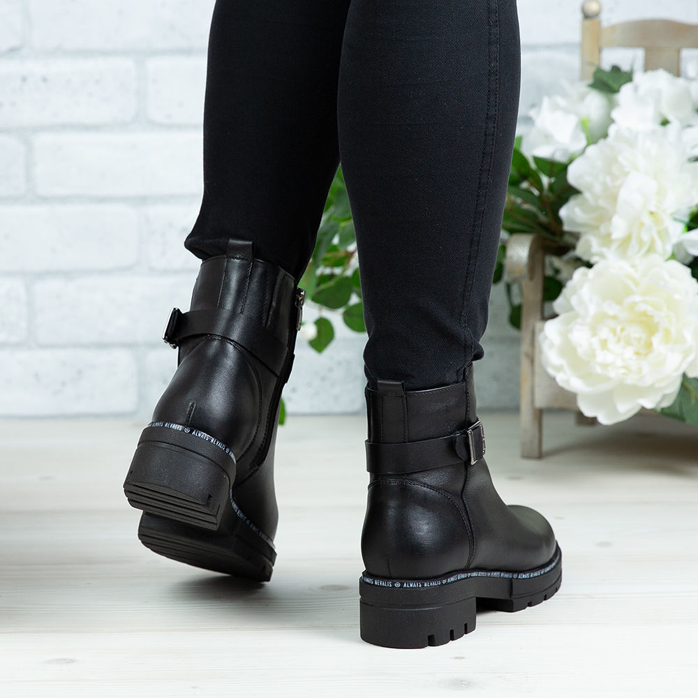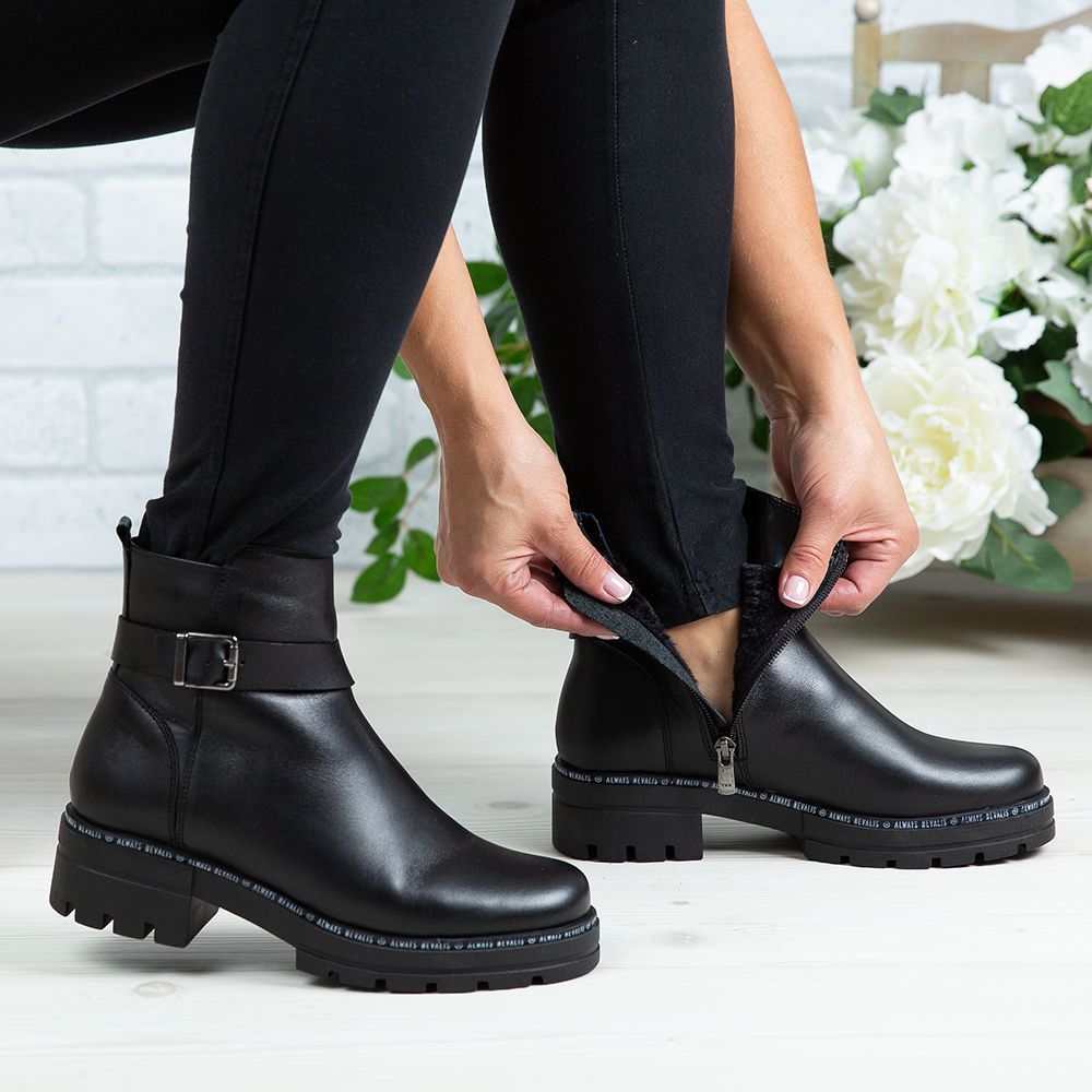Ghete damă din piele naturală de culoare neagră cu accesoriu metalic, interior confortabil din blană artificială și talpă din cauciuc natural / antiderapant.