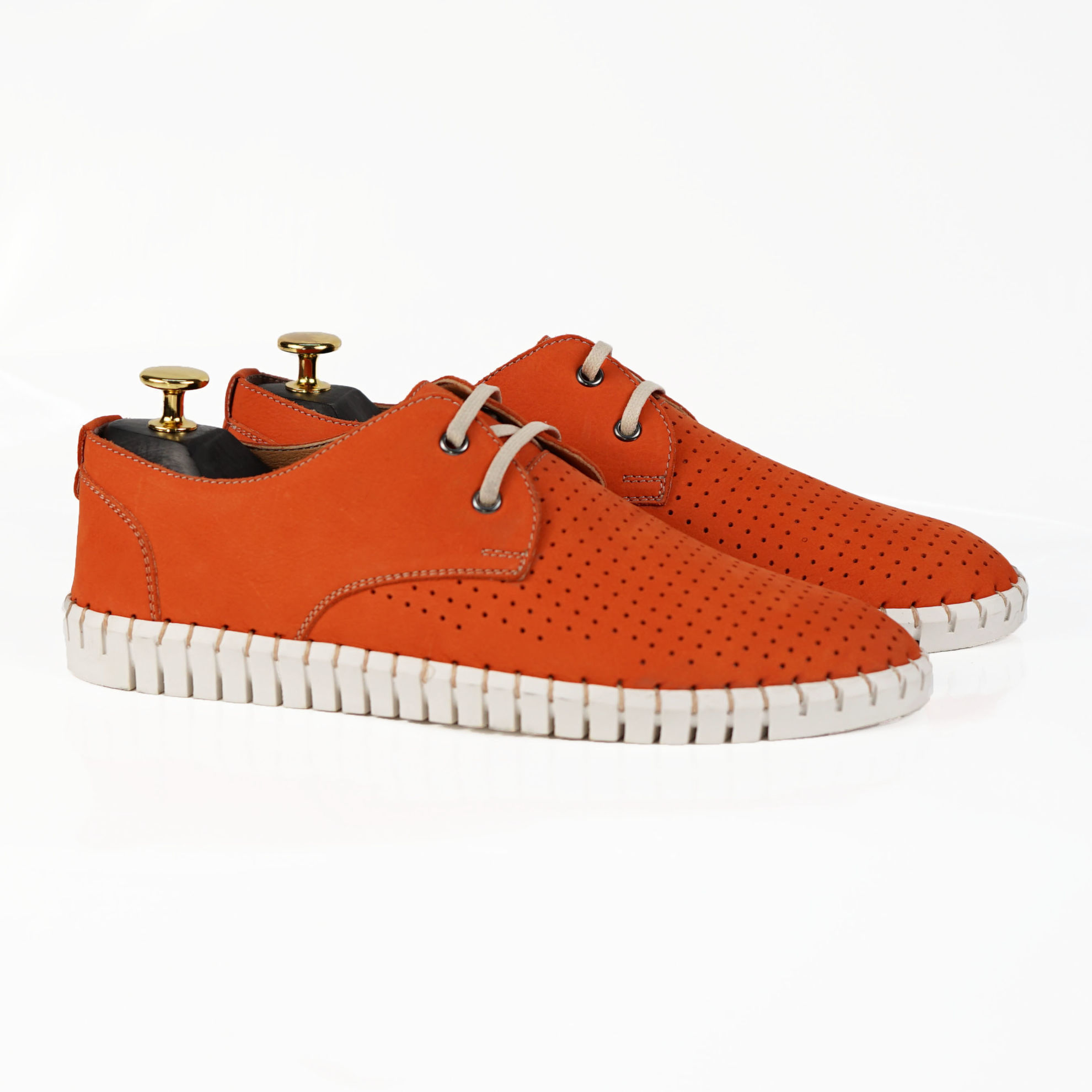 Pantofi casual bărbați din piele naturală perforată de culoare portocalie, cu interior confortabil din piele naturală și talpă ușoară și flexibilă din cauciuc natural.