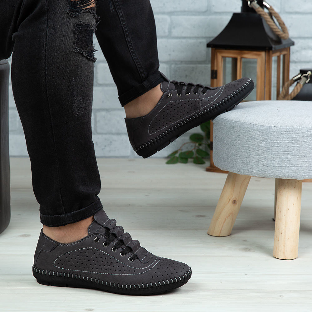 Pantofi casual bărbați din piele naturală de culoare gri nubuk, cu interior confortabil din piele naturală și talpă cusută manual, ușoară și flexibilă din cauciuc natural.