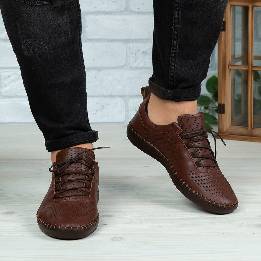 Pantofi casual din piele naturală de culoare maro cu perforații.