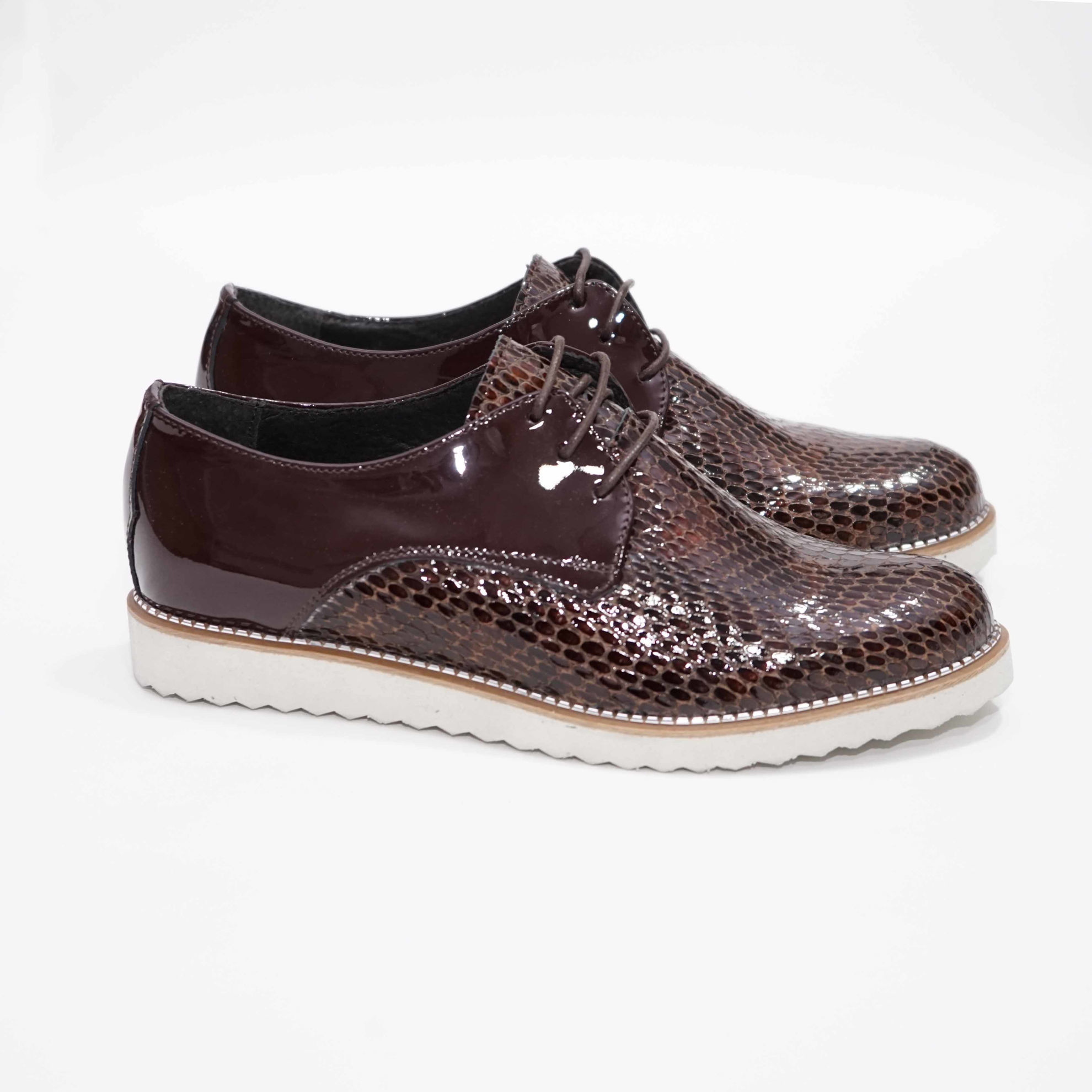 Pantofi damă din piele naturală lăcuită de culoare maro, cu interior confortabil din piele naturală și talpă din poliuretan PU.
