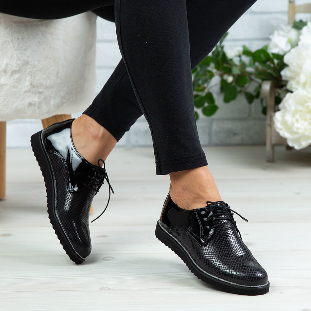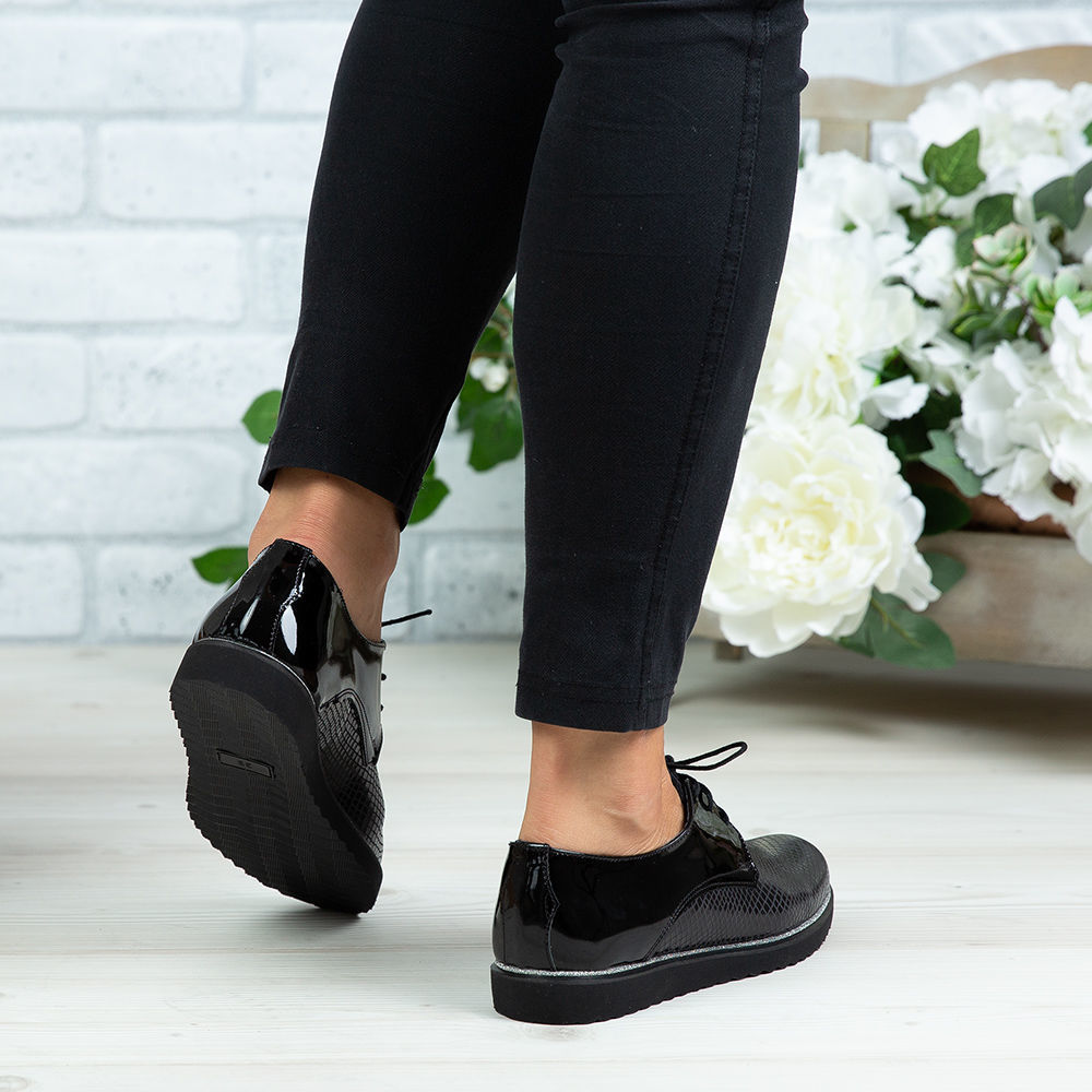 Pantofi damă din piele naturală lăcuită de culoare neagră, cu interior confortabil din piele naturală și talpă din poliuretan PU.