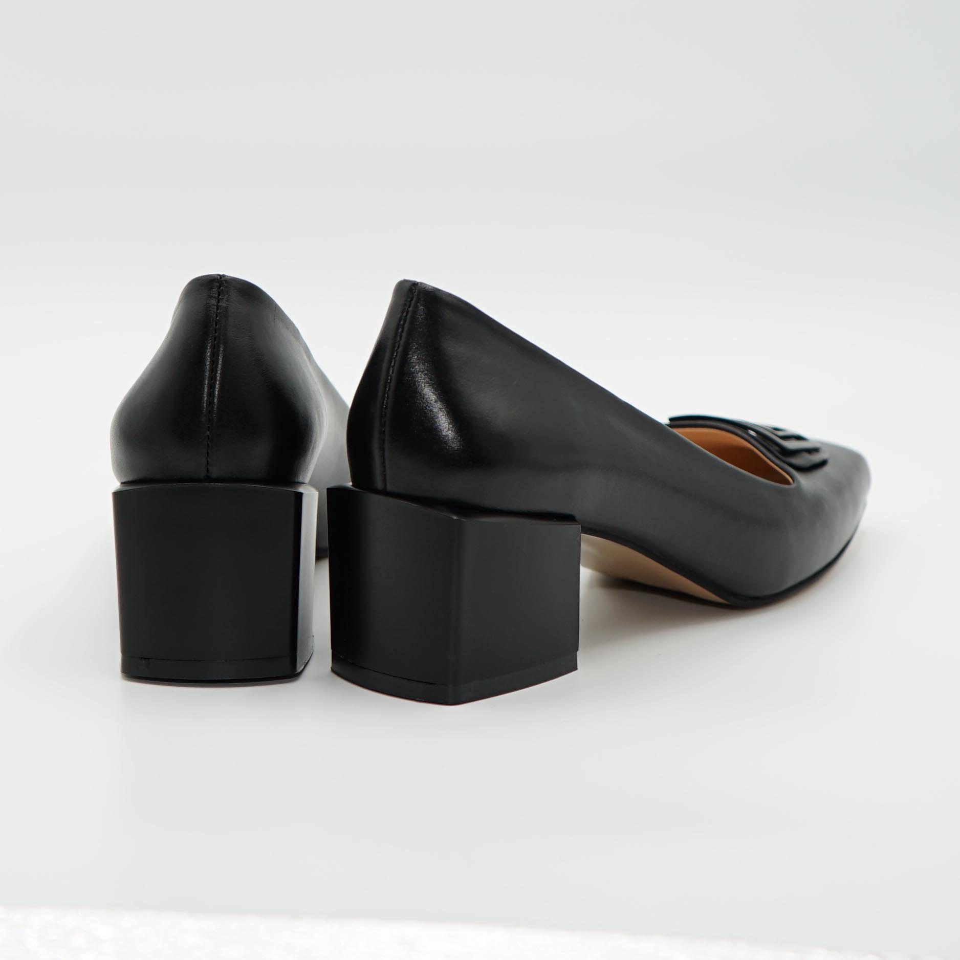 Pantofii eleganti dms019 sunt confecționați din piele naturală de vițel și cu accesoriu metalic de culoare neagra. Se caracterizează printr-un toc ușor de purtat într-o formă pătrată, cu o înălțime medie de 55 mm.