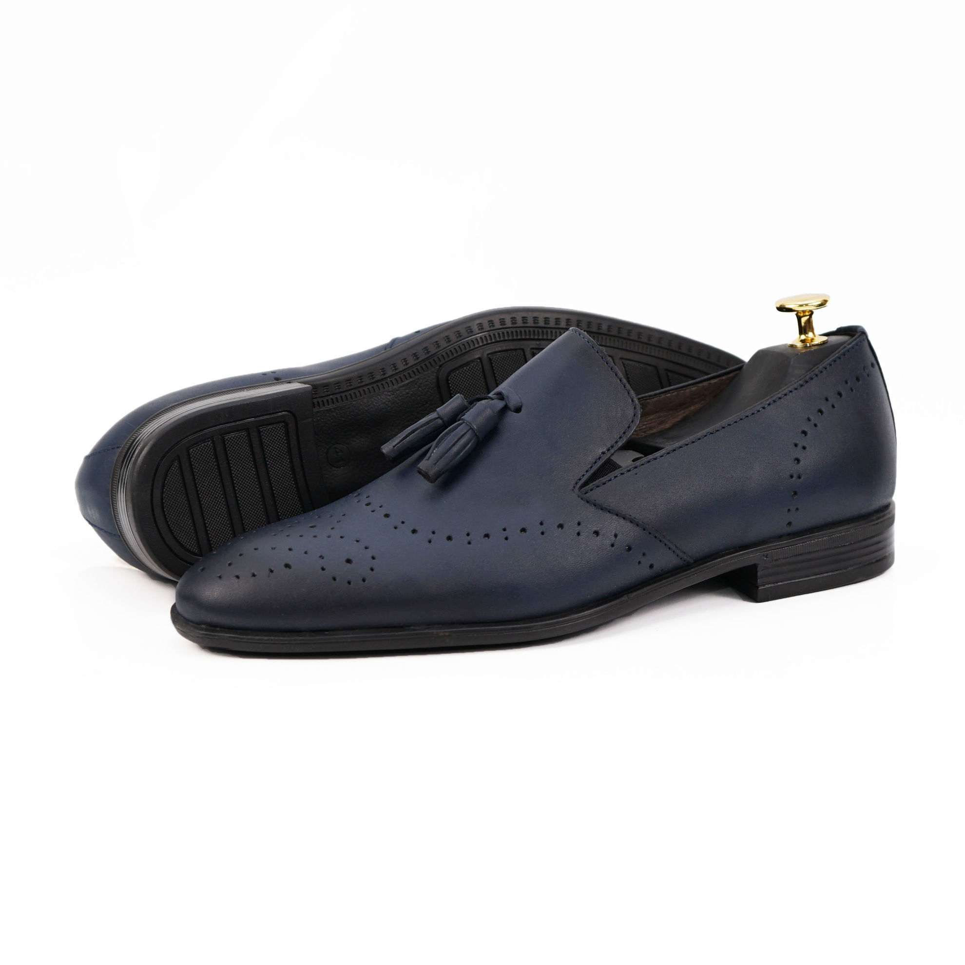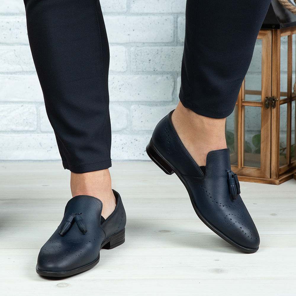 Pantofi eleganți bărbați din piele naturală de culoare bleumarin cu ciucuri decorativi, cu interior confortabil din piele naturală și talpă ușoară din TR.