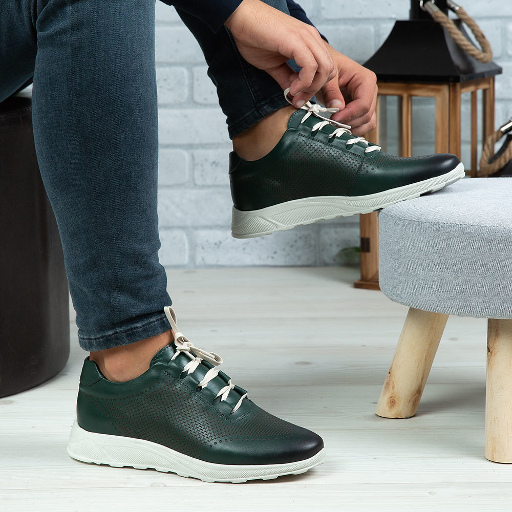 Pantofi sport bărbați din piele naturală de culoare verde, cu interior confortabil din piele naturală și talpă ușoară din poliuretan .