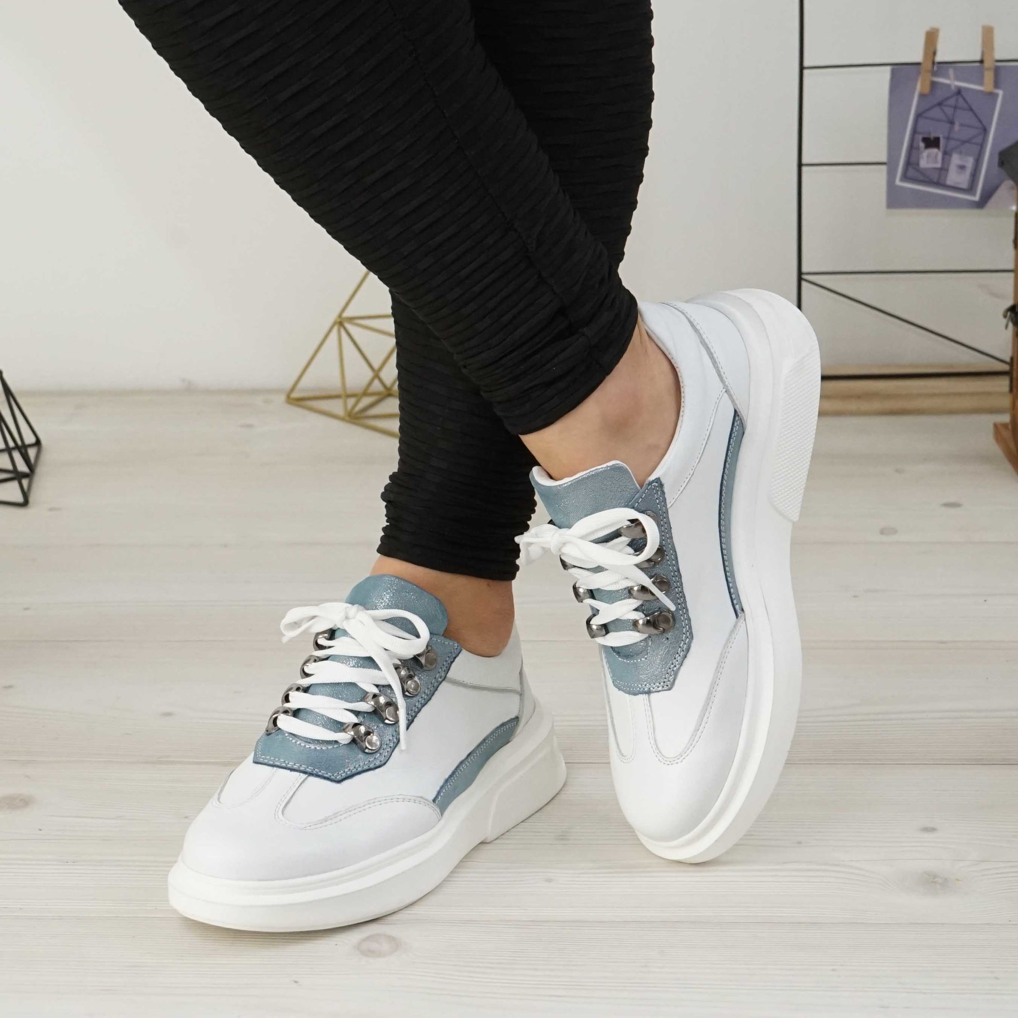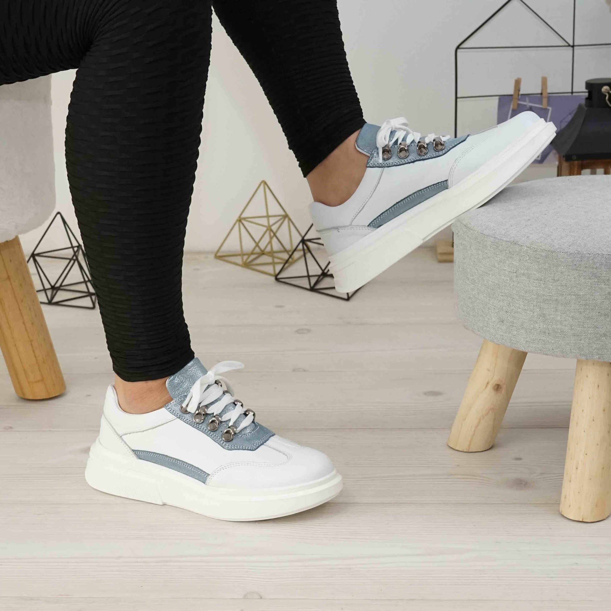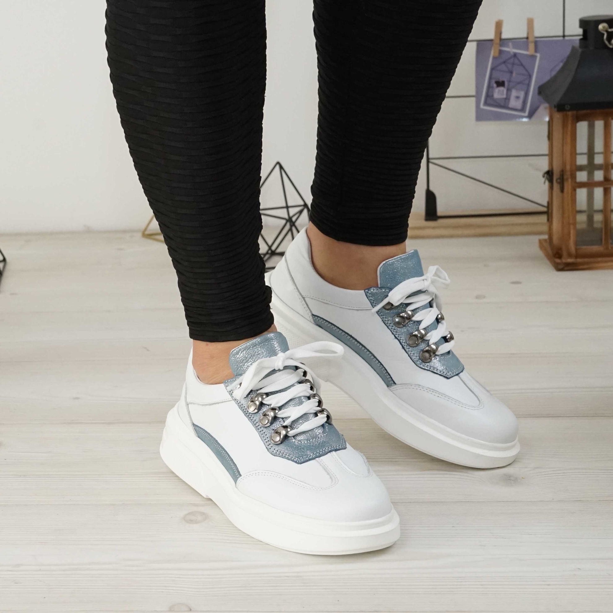 Pantofi damă din piele naturală de culoare alb-albastru, cu interior confortabil din piele naturală și talpă poliuretan PU.